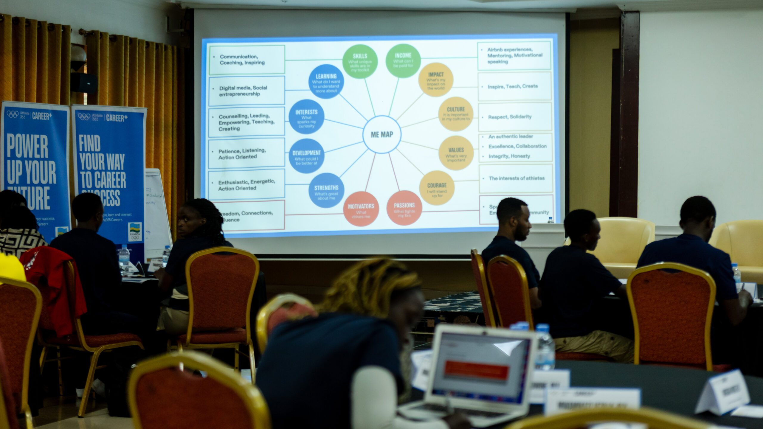 The workshop began with a deep dive into self-awareness through a creative tool known as the “Me Map.” This interactive exercise encouraged athletes to identify their skills, strengths, motivators, and passions.